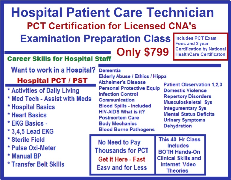 The CNA/ PCT position is an extension of the Activities of Daily Living - CNA Fundamentals of Nursing, Theories and Ethics as well as additional Career Skills not covered during the regular CNA Exam Prep Classes.