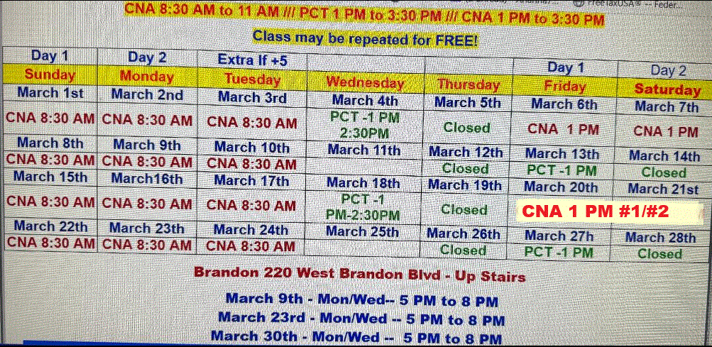 CNA 8:30 AM to 11 AM /// PCT 1 PM to 3:30 PM /// CNA 1 PM to 3:30 PM